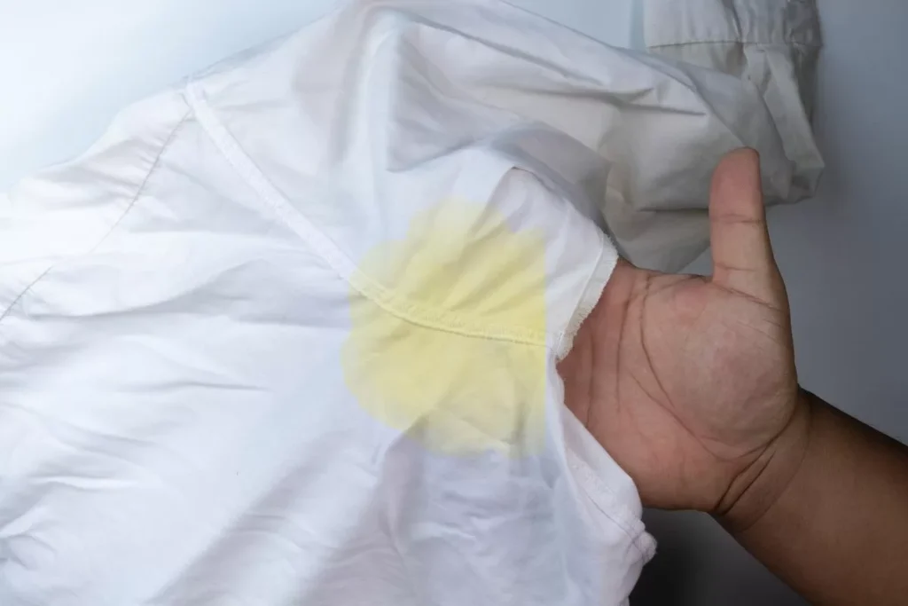 • Znoj in dezodorant: ta kombinacija, zlasti aluminijevi soli, ki so običajno v protipotnih sredstvih, povzroča rumene madeže, ki jih je težko odstraniti.