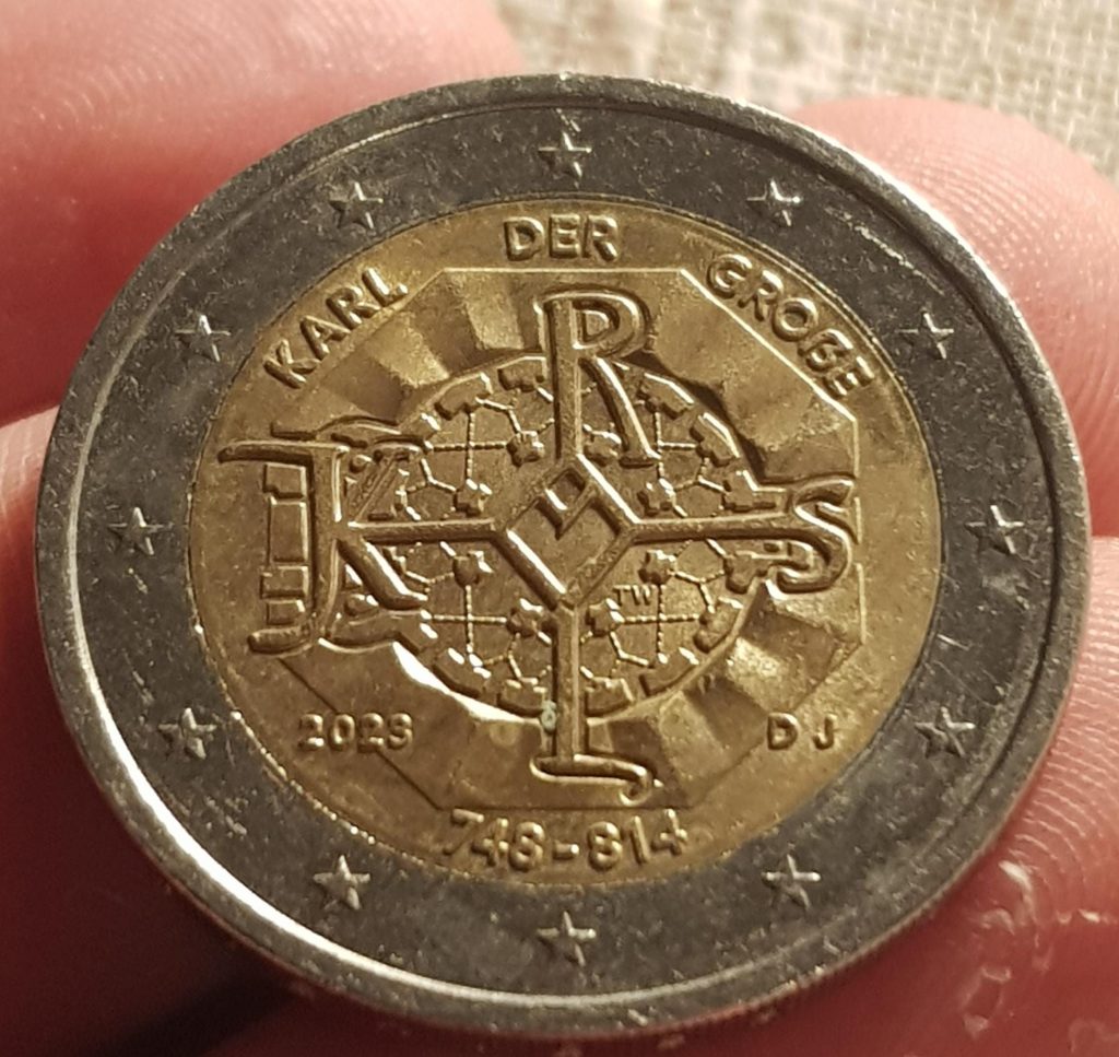 Con esta moneda, Alemania quiso celebrar el 1275 aniversario del nacimiento de Carlomagno (748-814), rey de los francos y emperador del Sacro Imperio Romano. El diseño se eligió a través de un concurso y de entre las dos propuestas que llegaron a la fase final, la de Tobias Winnen resultó ganadora.