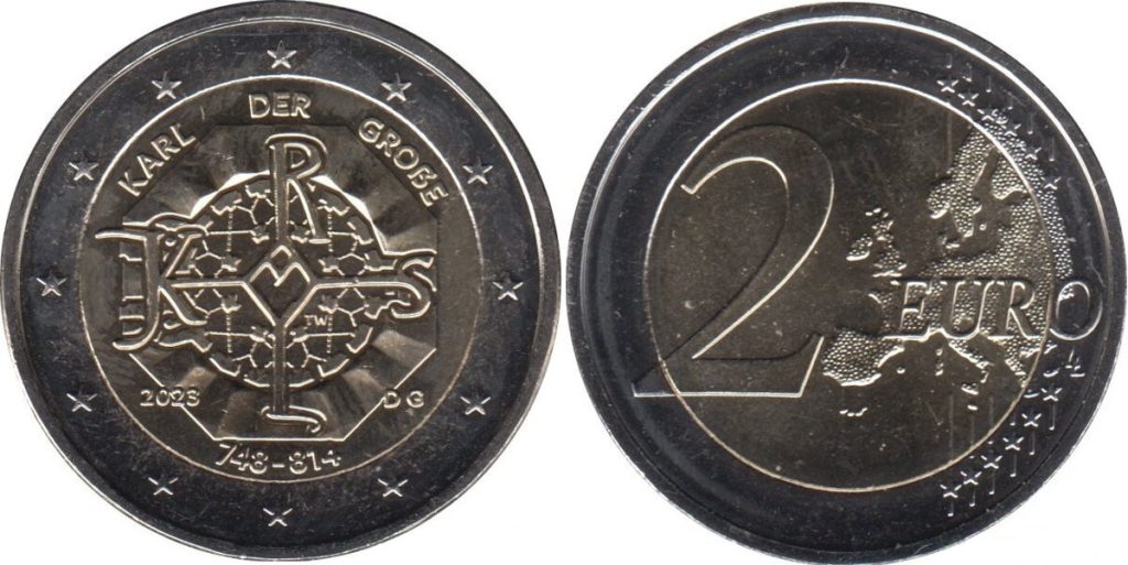 Na nacionalni strani dizajn združuje dva sodobna elementa: osebni monogram Karla Velikega in osmokotnik katedrale v Aachnu. Oba motiva sta spretno združena in ustvarjata dinamičen in tridimenzionalen učinek. Na notranjem obroču je v zgornjem delu napis „KARL DER GROßE“ (Karel Veliki), v spodnjem delu pa je letnica izdaje „2023“ in koda države izdajateljice „D“, povezana s črko kovnice, ki je kovala kovanec. Kot je znano, ima Nemčija pet tovarn, zato so črke lahko „A“, „D“, „F“, „G“ ali „H“. Na koncu tega dela sta navedena letnici rojstva in smrti Karla Velikega: „748–814“. Nazadnje, skrite med okraski osmerokotnika, so vidne inicialke umetnika „TW“. Na zunanjem krožnem obodu je 12 petkrakih zvezd EU.